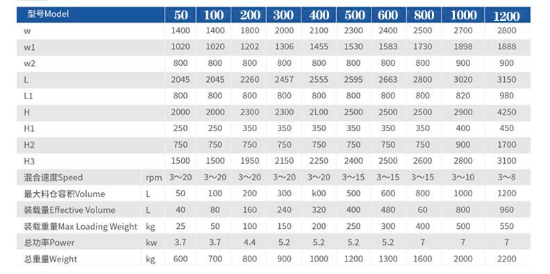 該機回轉體(混合料斗)與旋轉軸線成30°夾角,物料在隨著回轉體翻動的過程中,同時沿著四壁做切向運動,從而達到最佳的混合效果。