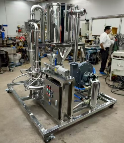 物料經(jīng)加料裝置定量加料,并以壓縮空氣為載體,將物料送入粉碎腔。進(jìn)入粉碎腔后,即受到特定的超音速氣流帶動(dòng),并有規(guī)律的形成物流,造成物料互相裝機(jī)、剪切,并同粉碎腔壁及上、下蓋碰撞、摩擦,形成三種粉碎狀態(tài),達(dá)到粉碎目的。在粉碎過程中,不同細(xì)度的顆粒,在旋轉(zhuǎn)氣流中,產(chǎn)生不同的離心力。粗顆粒由于受離心力大于向心氣流的作用力而被甩向周邊,繼續(xù)著粉碎過程;合格細(xì)度的顆粒由于向心氣流的作用力大于其離心力而被排氣氣流帶向出料口,通過管道進(jìn)入顆粒分級(jí)裝置或直接進(jìn)入旋流分離器,進(jìn)行氣、固分離,從而獲得成品。其尾氣再經(jīng)管道送入捕集器中,在收集余料后,凈化了的空氣被排空。